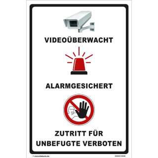 Videoüberwacht, Alarmgesichert, Zutritt für Unbefugte verboten - Videoüberwachung Schild