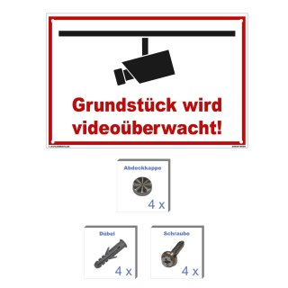 Grundstück - Videoüberwachung Schild 30x45 cm gelocht & Kit