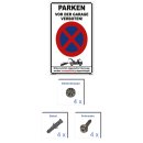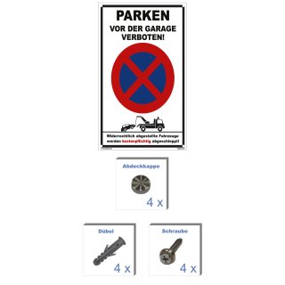 Hochwertiges Parkplatzschild 'Parken vor der Garage verboten!' mit Bohrlöchern und Montage-Kit