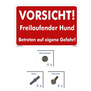 Vorsicht freilaufender Hund Schild 20x30 cm gelocht & Kit - Betreten auf eigene Gefahr - Ausgefüllt