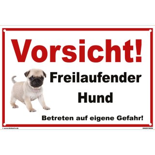 Vorsicht freilaufender Hund Schild mit Mops - Betreten auf eigene Gefahr